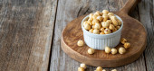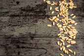 Orzechy sosny w ceramicznej misce i urządzone na eleganckim ciemnoszarym tle