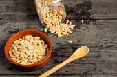 Orzechy sosny w ceramicznej misce i urządzone na eleganckim ciemnoszarym tle