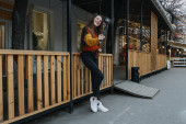 Zdjęcie "Młoda ruda kobieta ciesząca się słońcem i pijąca zabiera kawę włócząc się po zimowych ulicach miasta. Szczęśliwa młoda uśmiechnięta kobieta pije gorący napój na jarmarku Bożego Narodzenia, rynek" może być wykorzystywane do celów osobistych i komercyjnych zgodnie z warunkami zakupionej licencji Royalty-free. Obraz jest dostępny do pobrania w jakości wysokiej rozdzielczości do 5760x3840.