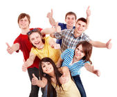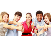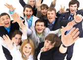 Grupa szczęśliwy radosny przyjaciół stały ręce do tyłu biały na białym tle na