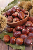 Pyszne palone kasztany jadalne w misce na drewnianym stole, widok powyżej