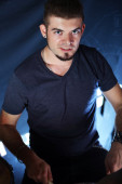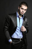 przystojny młody mężczyzna w kostiumie na ciemnym tle