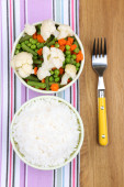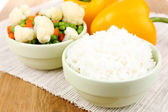 ugotowany ryż z warzywami na drewnianym stole z bliska
