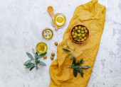 Zdjęcie "Marynowane zielone i czarne oliwki podawane w misach ze świeżymi gałązkami drzew. Zdrowe śródziemnomorskie jedzenie, miejsce na tekst." może być wykorzystywane do celów osobistych i komercyjnych zgodnie z warunkami zakupionej licencji Royalty-free. Obraz jest dostępny do pobrania w jakości wysokiej rozdzielczości do 5760x3840.