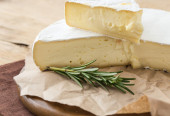 smaczny ser camembert z rozmarynem, na drewnianym stole