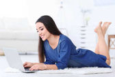 młoda kobieta odpoczynku z laptopa na podłodze w pobliżu kanapa, w domu