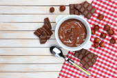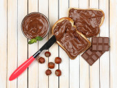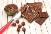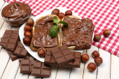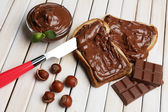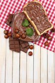 chleb z słodka czekolada z orzechami laskowymi rozprzestrzenił się na drewniane tła