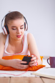 Młoda dziewczyna słuchać muzyki na tle wnętrz domu
