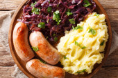 Zdjęcie "Smażone kiełbaski z puree ziemniaczanym, sosem cebulowym i groszkiem zielonym z bliska na talerzu na stole. Horyzont" może być wykorzystywane do celów osobistych i komercyjnych zgodnie z warunkami zakupionej licencji Royalty-free. Obraz jest dostępny do pobrania w jakości wysokiej rozdzielczości do 5760x3840.
