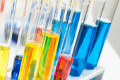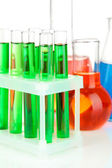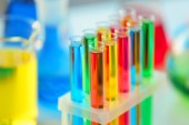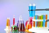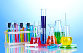 różne Naczynia laboratoryjne z kolor płynu na niebieskim tle