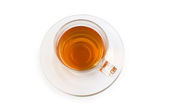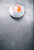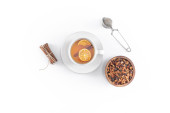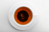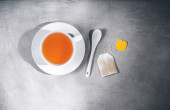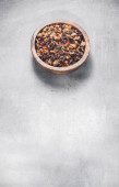 Koncepcja herbaty owocowej. Mieszanina suszonych płatków kwiatów i jagód wokół filiżanki na szarym stole. Topview, z góry