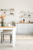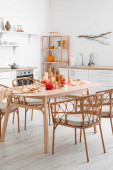 Nowy rok i Boże Narodzenie. Uroczysta kuchnia skandynawska w świątecznych dekoracjach. Świece, gałązki jodły, drewniane stojaki, stół.