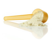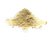 heap of dried pumpkin powder isolated on white background, selective focus