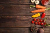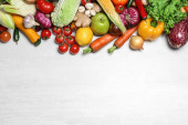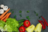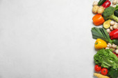 Płaska kompozycja układana ze świeżymi warzywami na szarym stole. Miejsce na tekst