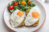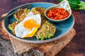 Cukinia i zielony groszek placki z jajkiem smażonym i salsa pomidorowa - zdrowe wegetariańskie jedzenie