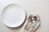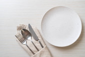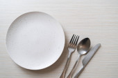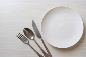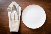 Pusta płyta lub talerz z nożem, widelcem i łyżką na tle drewnianych płytek