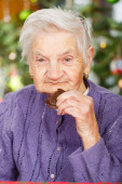 Siwowłosy mężczyzna stojący z talerzem z ciastkami i pachnący