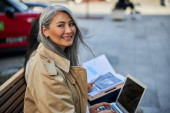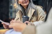 Zdjęcie "Piękna radosna kobieta siedząca przy stole w kawiarni na świeżym powietrzu" może być wykorzystywane do celów osobistych i komercyjnych zgodnie z warunkami zakupionej licencji Royalty-free. Obraz jest dostępny do pobrania w jakości wysokiej rozdzielczości do 5760x3840.
