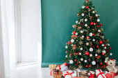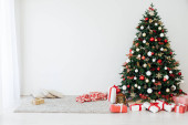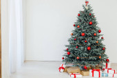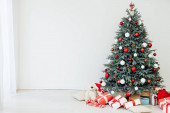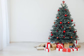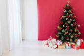 Nowy Rok Czerwona Choinka wystrój z prezentów i girlandy wnętrza