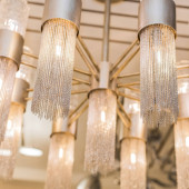 Zbliżenie na jeden świecący luksusowy drogi żyrandol z kryształowego sufitu abażur. Klasyczny styl w nowoczesnym wnętrzu. Do środka. Ciepłe światło. Szczegółowe informacje.