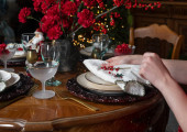 Female hands close up set the table for christmas, decorating it with white napkin, plates and wineglass, cutlery. Prepararion for festive dinner, side view.
