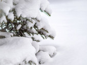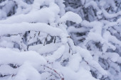 Zimą gałęzie drzew pokryte śniegiem i mrozem w śniegu. Zamrożone gałęzie drzew. Ośnieżone gałęzie w zimowym lesie. Magiczne białe tło.