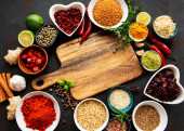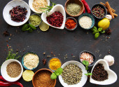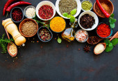 Zdjęcie "Różne przyprawy w misach na czarnym betonowym tle. Góra widok miejsca kopiowania." może być wykorzystywane do celów osobistych i komercyjnych zgodnie z warunkami zakupionej licencji Royalty-free. Obraz jest dostępny do pobrania w jakości wysokiej rozdzielczości do 5760x3840.