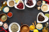 Różne przyprawy w misach na czarnym betonowym tle. Góra widok miejsca kopiowania.