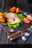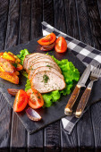 Pieczona szynka w plasterkach ze świeżymi pomidorami na kamiennym talerzu w stylu rustykalnym