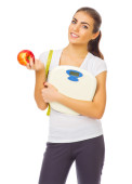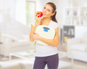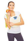 Zdjęcie "Młoda zdrowa kobieta z jabłkiem i wagi" może być wykorzystywane do celów osobistych i komercyjnych zgodnie z warunkami zakupionej licencji Royalty-free. Obraz jest dostępny do pobrania w jakości wysokiej rozdzielczości do 5760x3840.