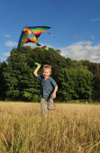 Mały chłopiec trzyma latawiec na zielonej łące, letni motyw zabawy.