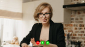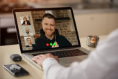Widok ekranu laptopa aplikacji telekomunikacyjnej podczas spotkania internetowego nad ramieniem mężczyzny. Widok pracownika trzymającego słuchawki na wideokonferencji z kolegami.