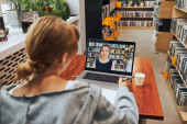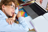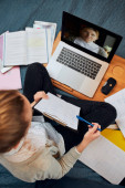 Młoda uczennica ma zajęcia, uczy się przez internet, ogląda lekcje zdalnie, słucha profesora, rozmawia z kolegami z klasy na wideo rozmowie z domu podczas kwarantanny. Młoda dziewczyna korzystająca z laptopa, słuchawek, książek, podręczników siedzących na łóżku