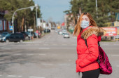 Młoda kobieta w masce medycznej wychodzi na zewnątrz. Ochrona osobista podczas pandemii COVID-19