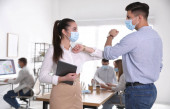 Współpracownicy w maskach ochronnych uderzają łokciem w biurze. Nieformalne powitanie podczas pandemii COVID-19