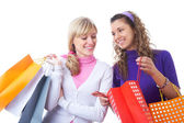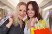 uśmiechnięte młode kobiety zabawy podczas robienia zakupów w centrum handlowym