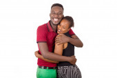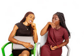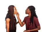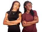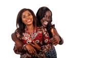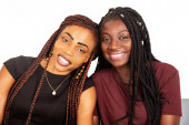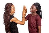 dwie młode dziewczyny stojące na białym tle trzymające się za ręce patrzące na siebie uśmiechnięte.