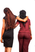 dwie młode kobiety stojące samotnie na białym tle śmiejąc się obejmując.