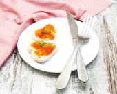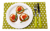 naleśniki z kawiorem czerwonym na talerzu, kolor serwetka, na białym tle