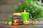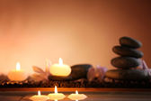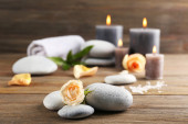 drewniana miska spa kamienie i świece na drewnianym stole, na tle kwiatów