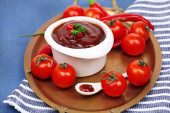 sos pomidorowy, w misce na drewniany stół szczegół