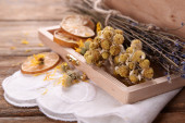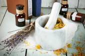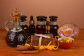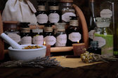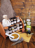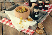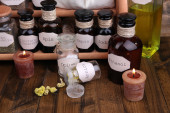 Kompozycja z pustej strony, świec, zaprawy i historycznych starych butelek aptecznych z etykietą na drewnianym tle