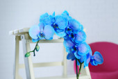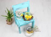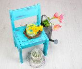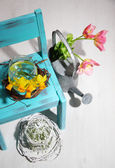 piękne wiosenne kwiaty na niebieski stare drewniane krzesło