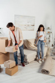 pełna długość uśmiechniętego mężczyzny z kartonowymi pudełkami patrzącego na kobietę trzymającą rękawiczki w domu