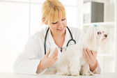 Piękna młoda kobieta weterynarz badania psa w klinice