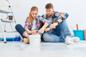 pełna długość uśmiechnięty młody mężczyzna wylewa farbę w rolki taca w pobliżu kobiety w domu