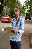 młody turysta w czarnych okularach przeciwsłonecznych dzierżawca i czyta mapę miasta w ręku