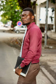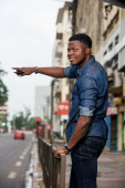młody turysta stojący i trzymający mapę miasta uśmiechnięty
