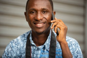 młody turysta siedzi na zewnątrz i rozmawia przez telefon komórkowy uśmiechnięty.