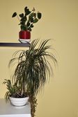 Garnek z zieloną rośliną na schodach na drewnianej podłodze w pokoju.